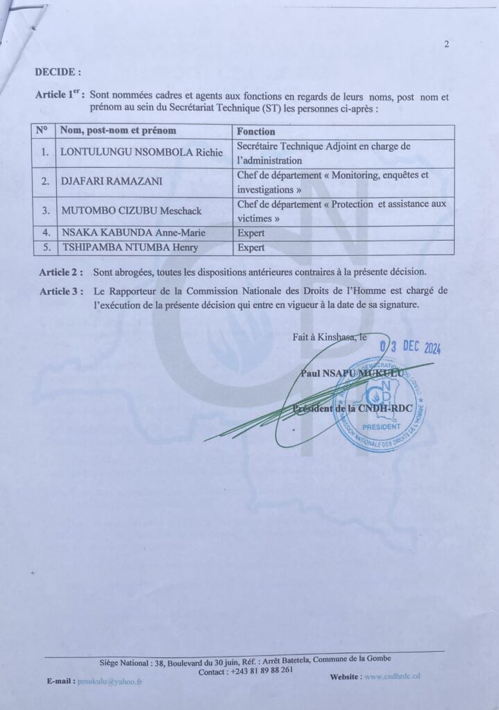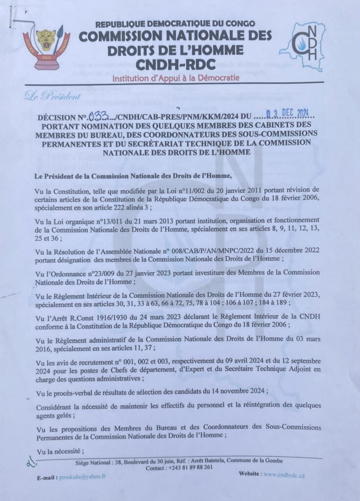 Un communication officielle de la Commission Nationale des Droits de l’Homme a été lue le lundi 03 décembre dernier à la Télévision Nationale (RTNC) annonçant son recrutement à ce poste.