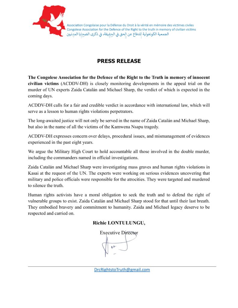 A statement released both in French and English by the Congolese Association for the Defense of the Right to Truth in Memory of Innocent Civilian Victims (ACDDV) expressed concern over delays, procedural issues, and mismanagement of evidence experienced in the past eight years.