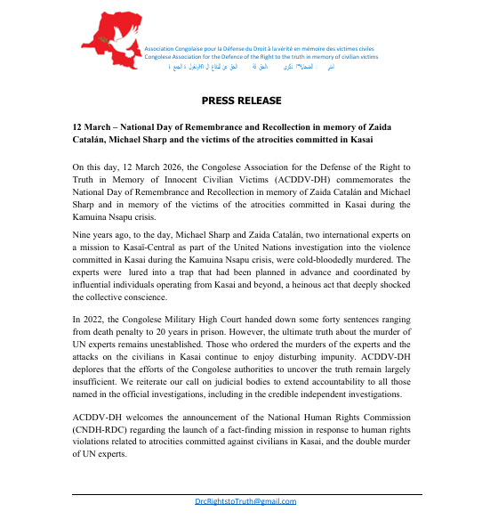 Kinshasa, DRC – Thursday 12 March, the Congolese Association for the Defense of the Right to Truth in Memory of Innocent Civilian Victims (ACDDV-DH) commemorates the National Day of Remembrance and Recollection in memory of Zaida Catalán and Michael Sharp and in memory of the victims of the atrocities committed in Kasai during the Kamuina Nsapu crisis.